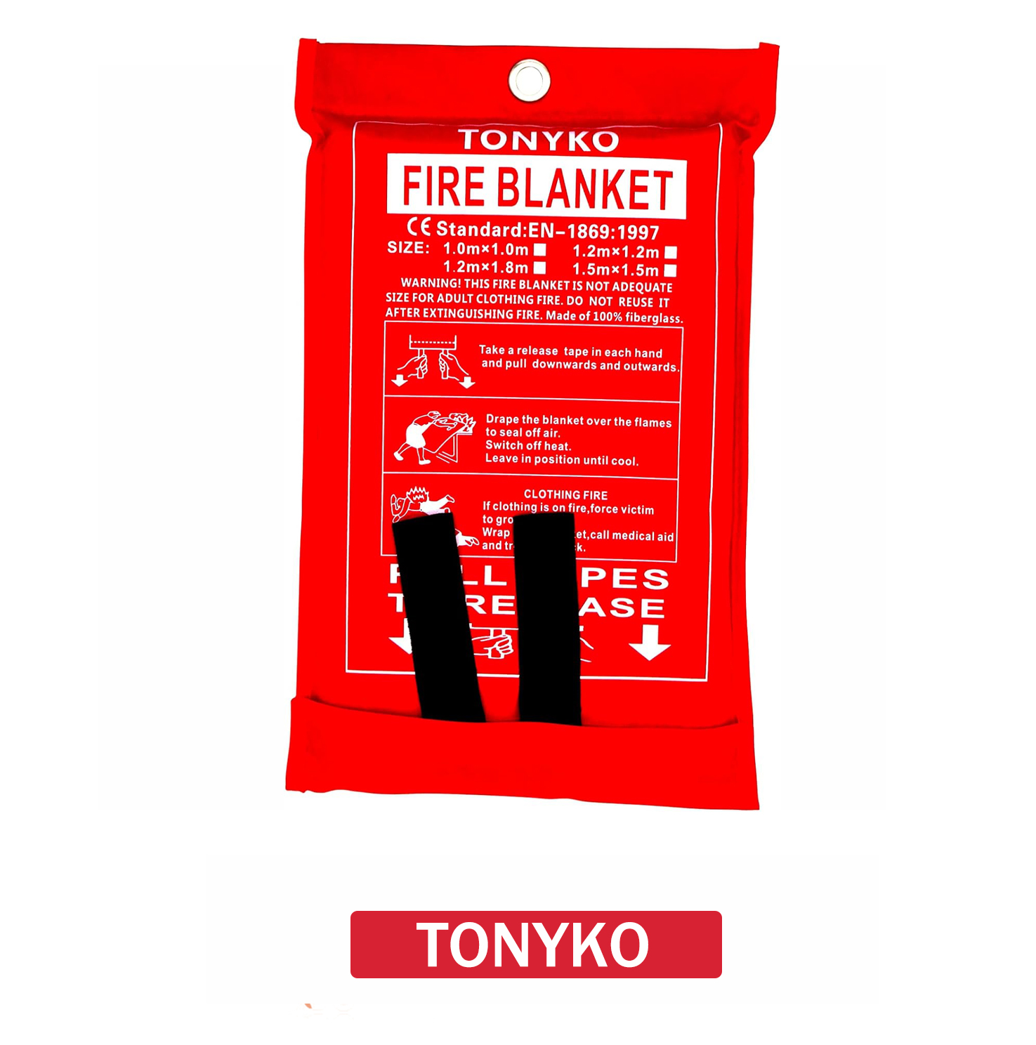 Pull the tabs to release the blanket and toss it over any small fire to suffocate it instantly.